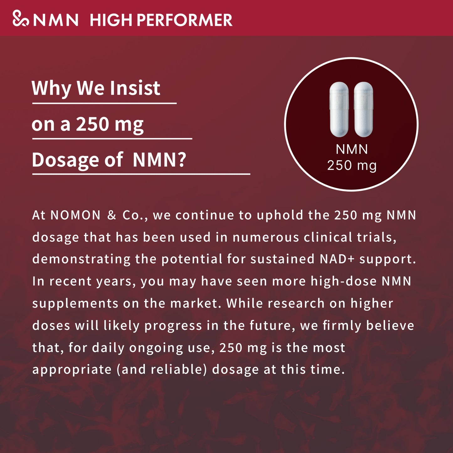 These days, you might see many high-dose NMN supplements online. While future research may explore higher doses, we remain convinced that, at this stage and for consistent daily intake, 250 mg is the appropriate (and reliable) amount.