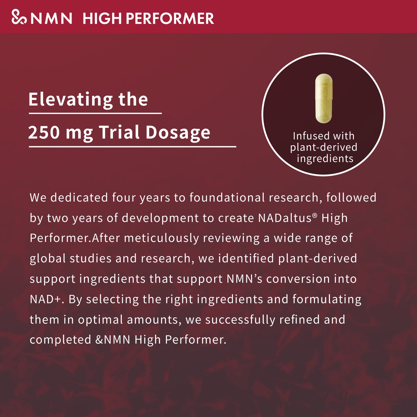 A: &NMN HIGH PERFORMER is a product that, in addition to NMN (nicotinamide mononucleotide)—the main ingredient of Nadaltus®—includes extra components developed through joint research by NOMON Inc. and Teijin Ltd. to further support NMN.